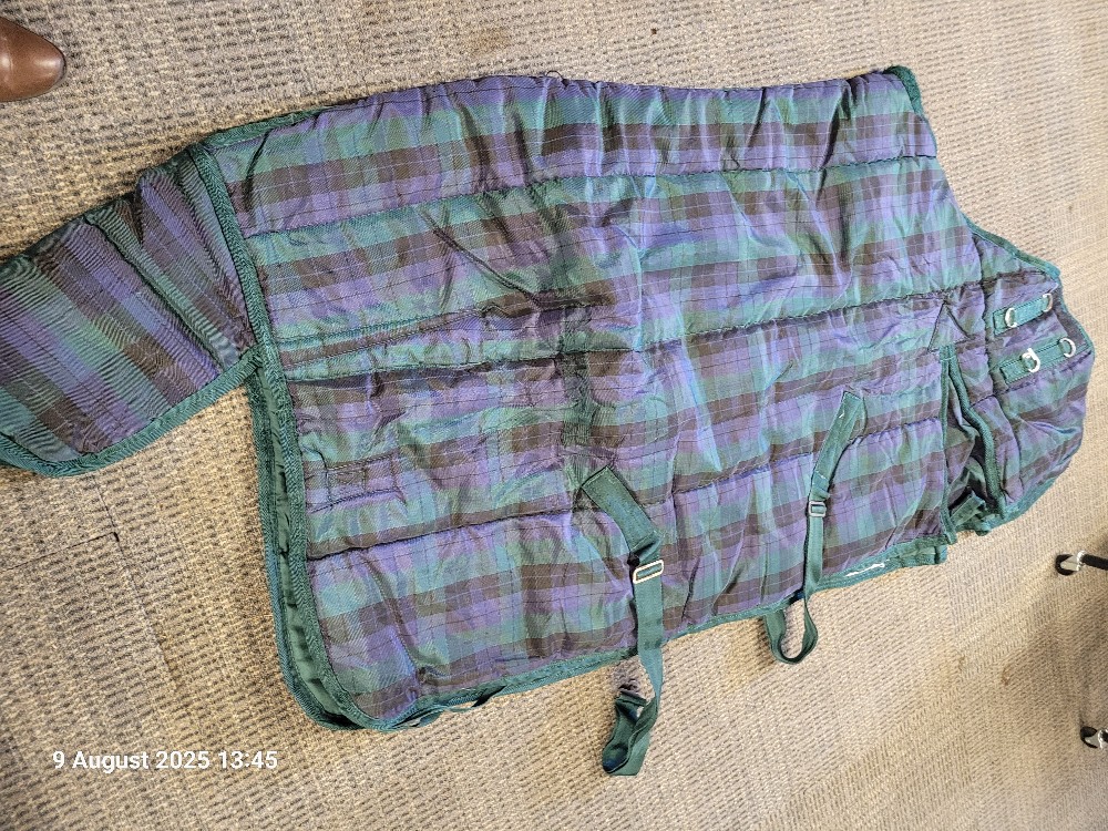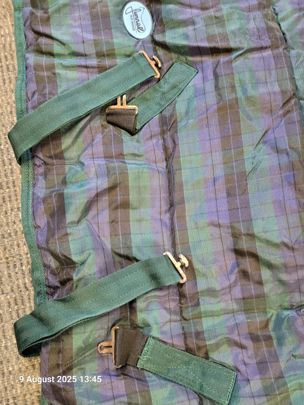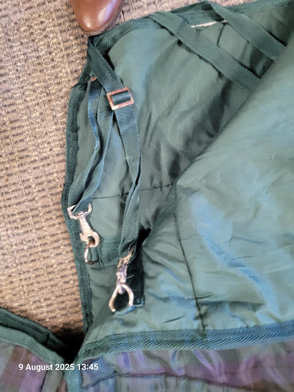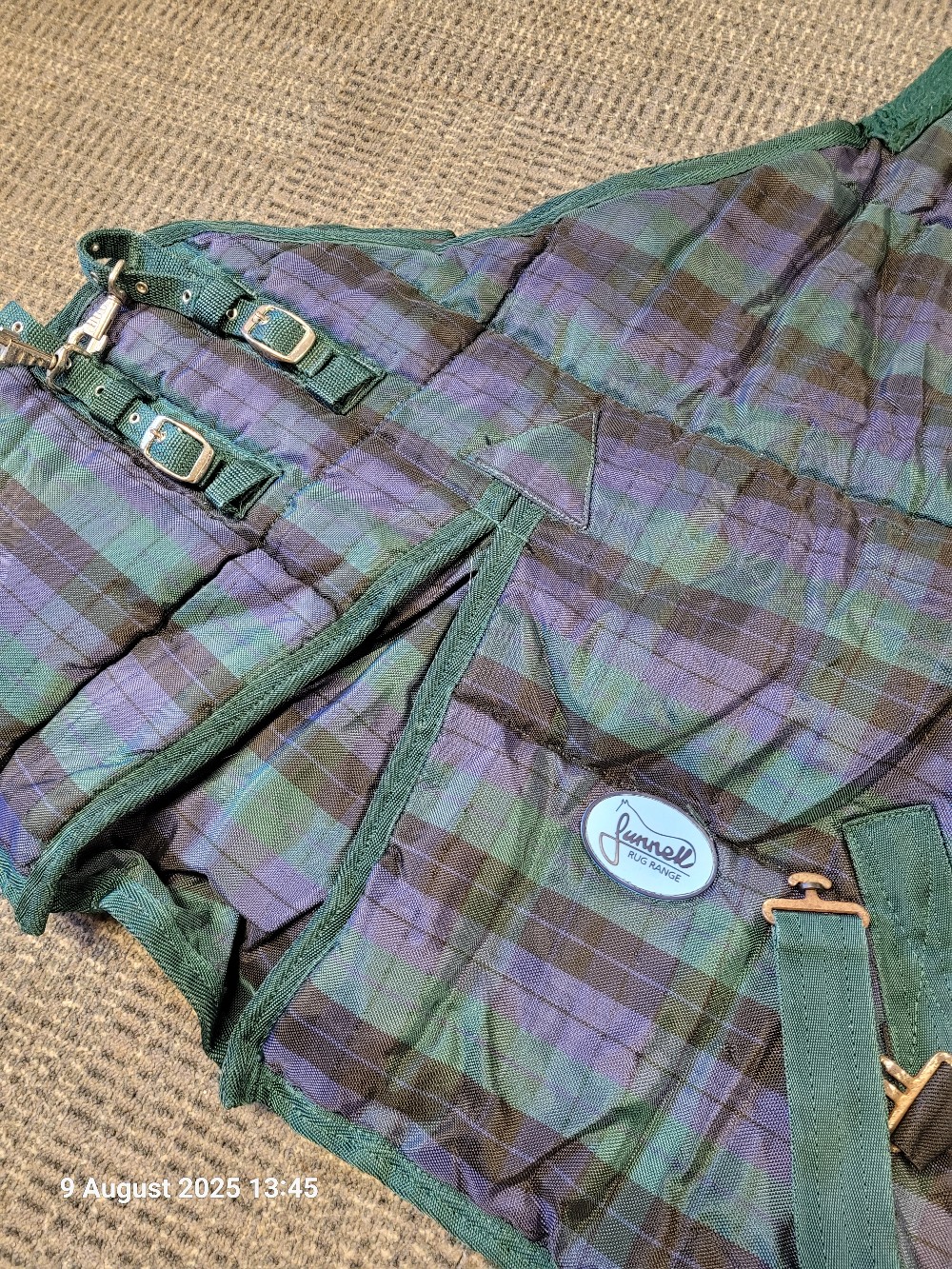Stable Rug No Neck Size 5'3 weight 300gm Colour Navy/Green Tartan USED Good working order just some rust spots on metalware