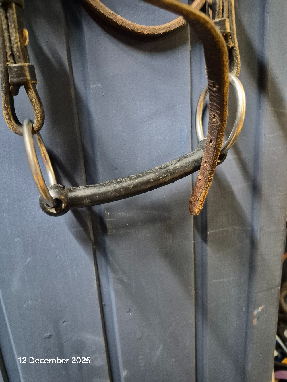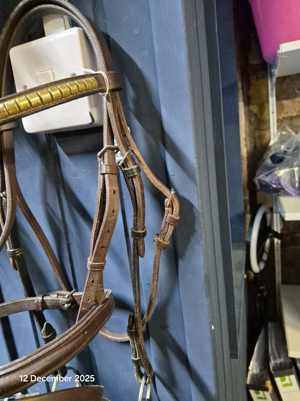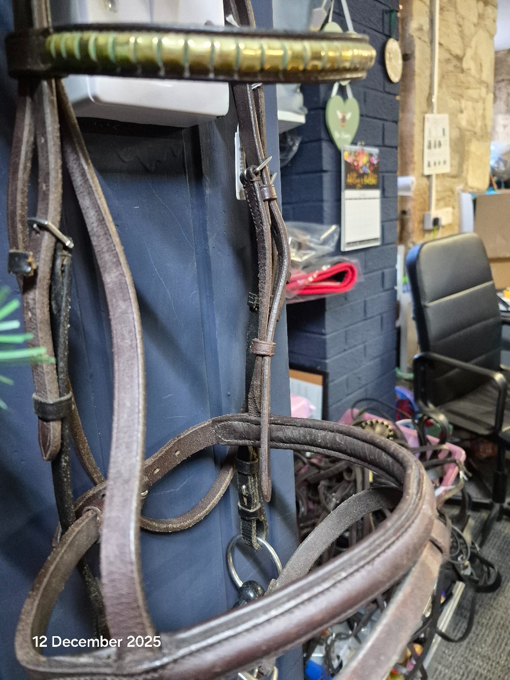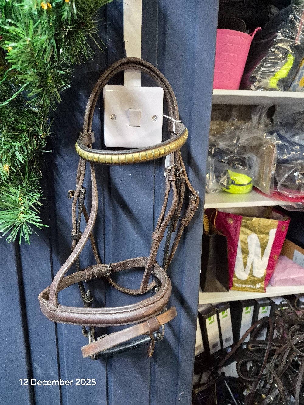 Bridle with Brass Browband & 4" Loose Ring Rubber Bit Size Pony COlour Brown USED Good working order just needs a wee oil