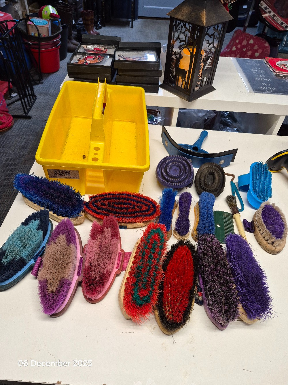Grooming Box with 13 brushes, 3 currie comb, 1 scrapper, 1 hoof pick, 1 oil brush, 1 combUSED Condition