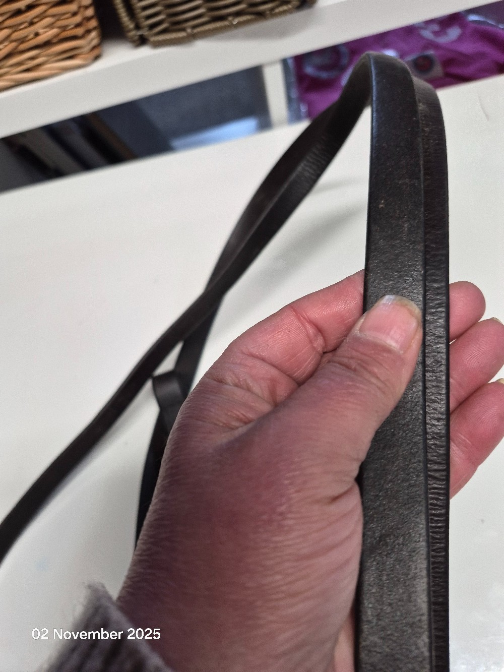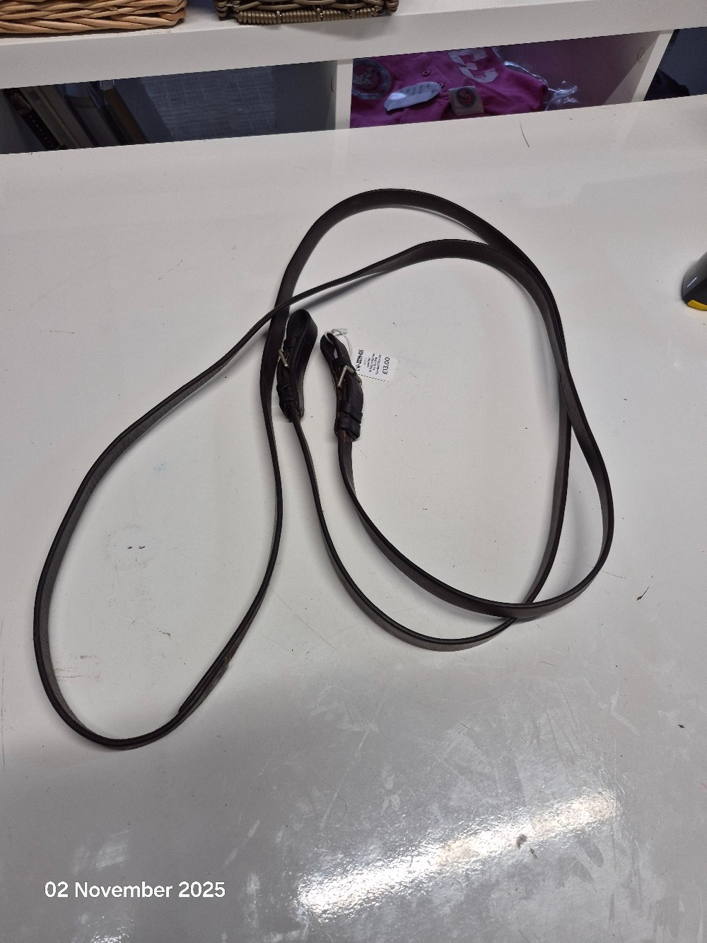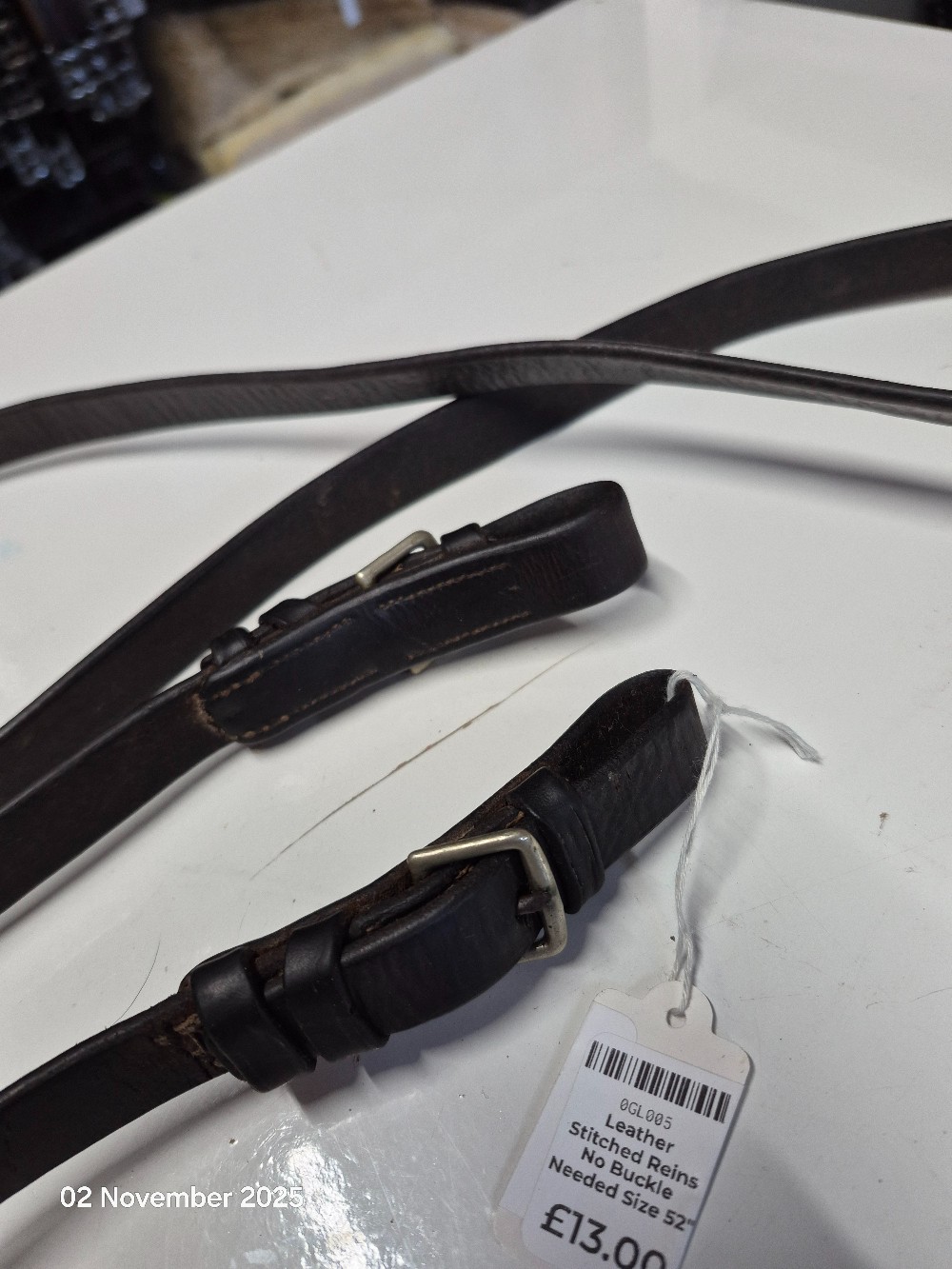 Leather Stitched Reins No Buckle Needed Size 52" Colour Brown USED Good working order small bit of rust on buckle pins